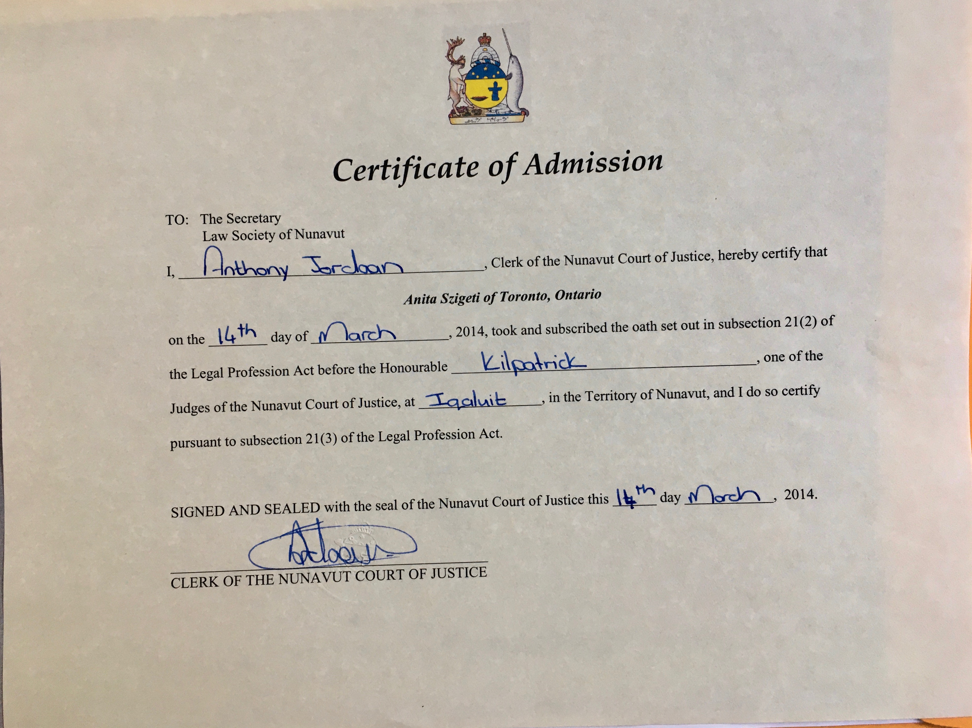 I will never forget being called by the Chief Justice of Nunavut on March 14 2014.