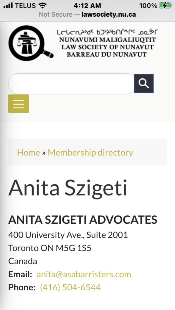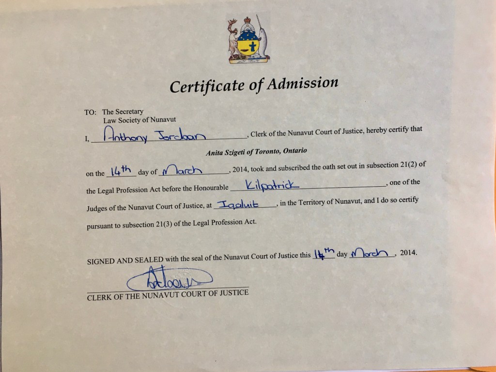 Today I received an alert that I am officially listed on the Website as a member of the Law Society of Nunavut. Nobody could find me there before. I think I inadvertently refused to authorize the Society to publish details of my membership. Proud today to see all the info ‘in lights’ here: