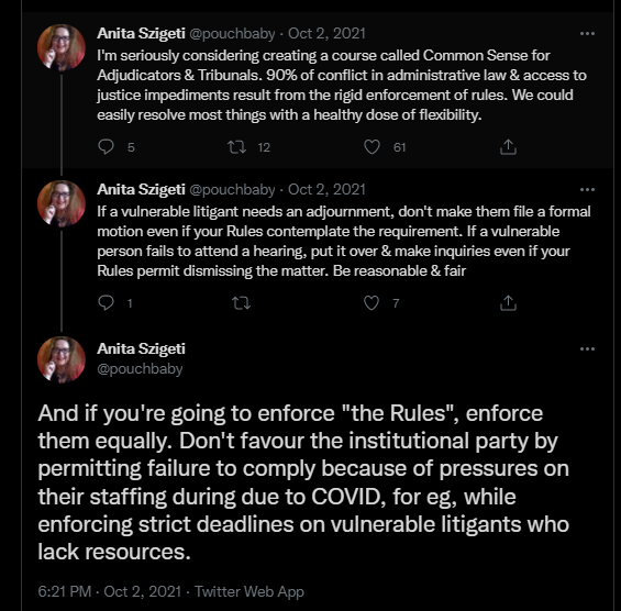 I was reminded by the kind organizers of this extraordinary event that last October, I tweeted out some frustration with administrative tribunals’ proceedings. This is what I said: