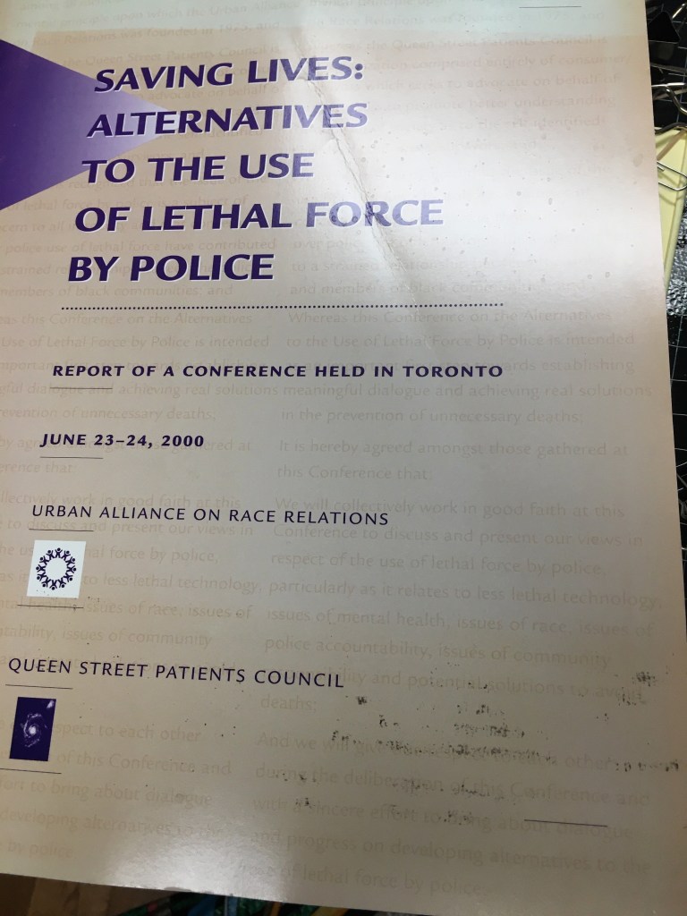 The Only Such Conference of its kind ever held – by the Queen Street Patients Council together with the Urban Alliance on Race Relations led to this Amazing Report – still the basis of Deescalation Training today