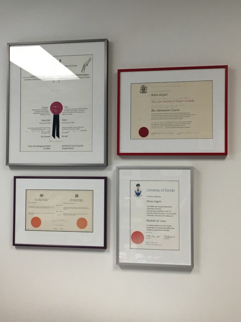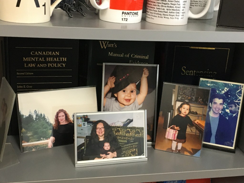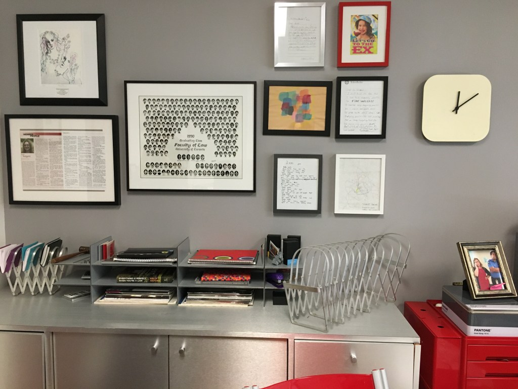Credenza Custom Built for me by the Founding Owner of Style Garage for the 94 Cumberland Offices of Hiltz Szigeti LLP originally in 2002 – still going strong literally 20 years later – my 1990 Graduating Class Photo – U of T Faculty of Law, my CLA Profile by (now Justice) Joe Di Luca (circa 2012), my Award from MHLC (1997) and children’s art and letters