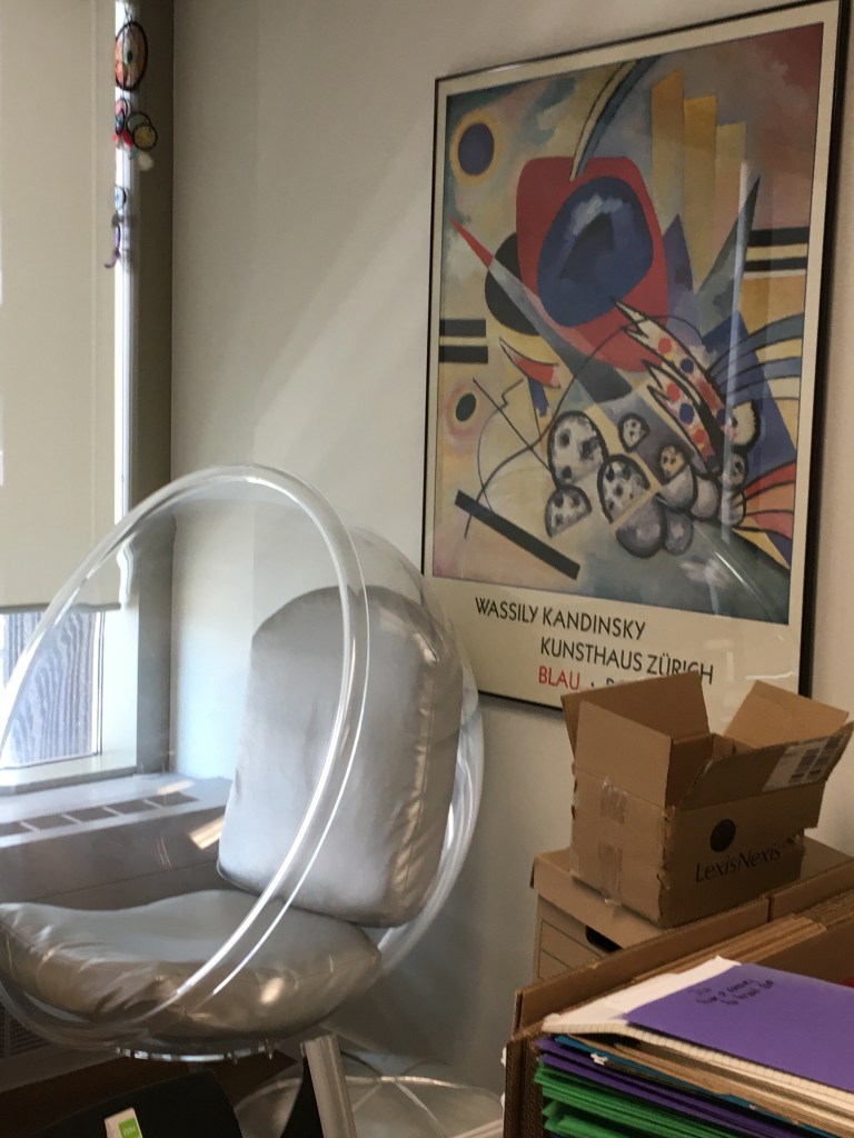 Fabulous Floor Model Bubble Chair – space age – and my Kandinsky Poster I’ve had my entire career – 30 years and counting