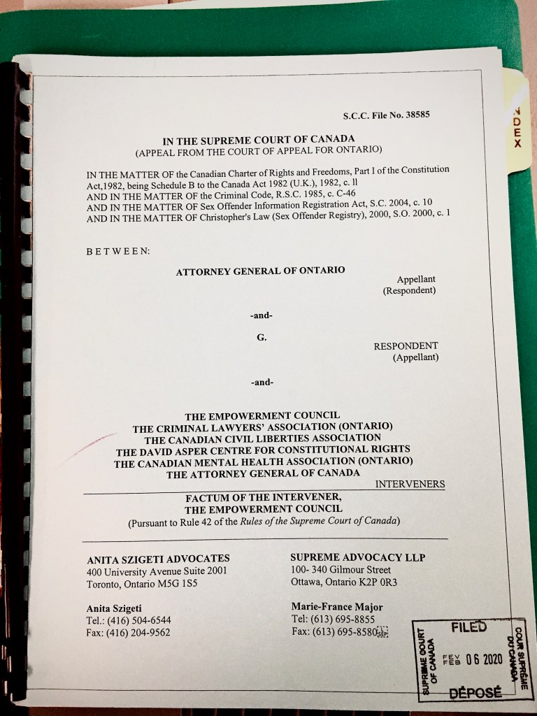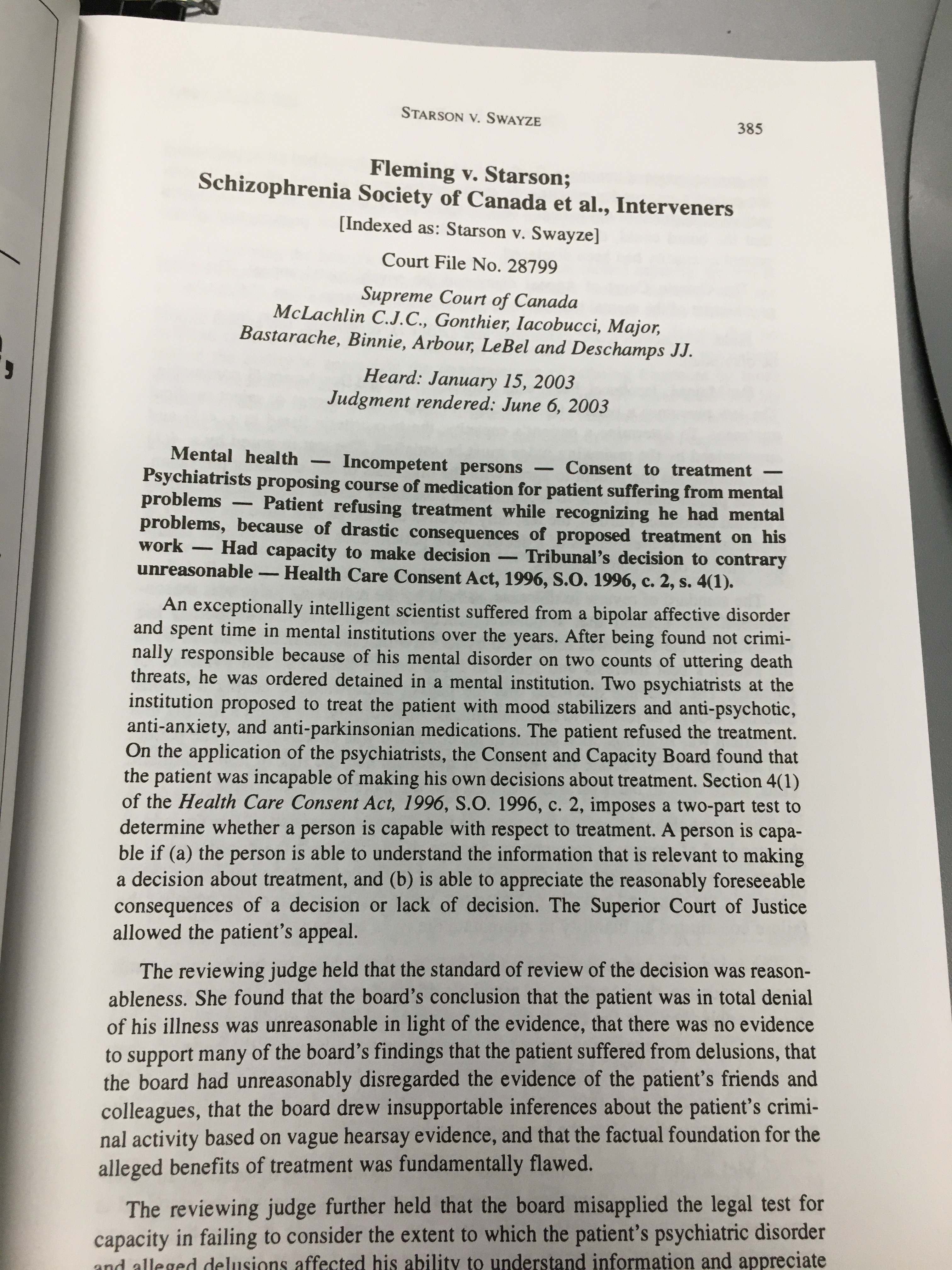 G v. AG – my involvement in this case for the Empowerment Council started at the Court of Appeal level where we argued the case before a panel presided over by Doherty JA. A memorable day in Court and a beautiful Judgment of the ONCA upheld finally by the SCC. I made submissions in our country’s top Court without mentioning the law. A unique outing for the arguments alone, but a very special day for my daughter and me. She returned to the SCC 17 years after her first visit with me on Starson as a 10 week old infant. I was surrounded that day by a lot of people I loved. This case meant a lot to me.