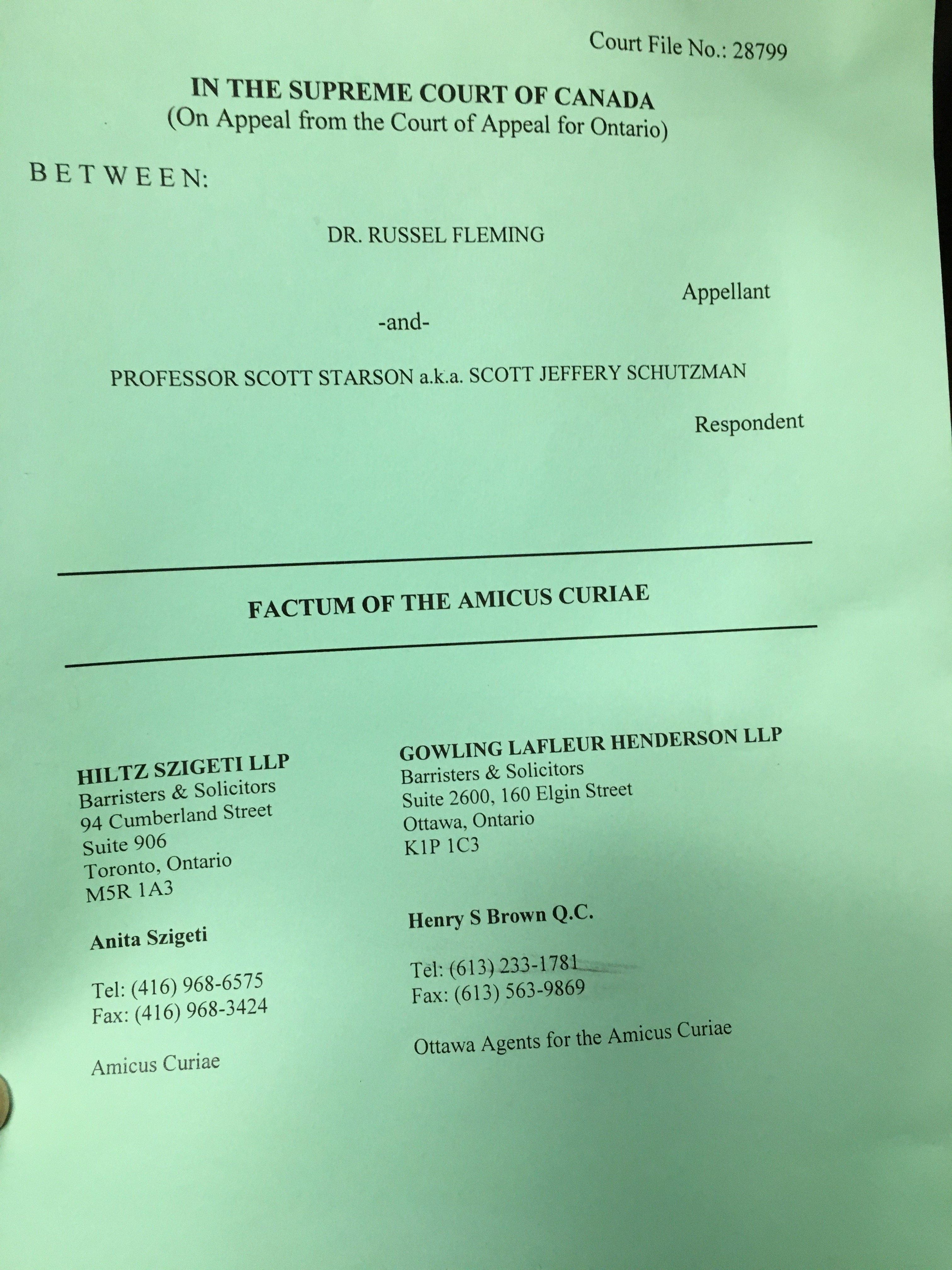 The Factum Cover as filed in the SCC on Starson – When I handed this to the last courier the night before it was due for filing with the SCC at 7:30 pm at the Cumberland Office, the other hand held a very poopy diaper of newborn daughter who was with me in a bassinet at the office while I worked – I was so tired I actually worried about mixing up the contents of the package to be delivered to our country’s top Court.