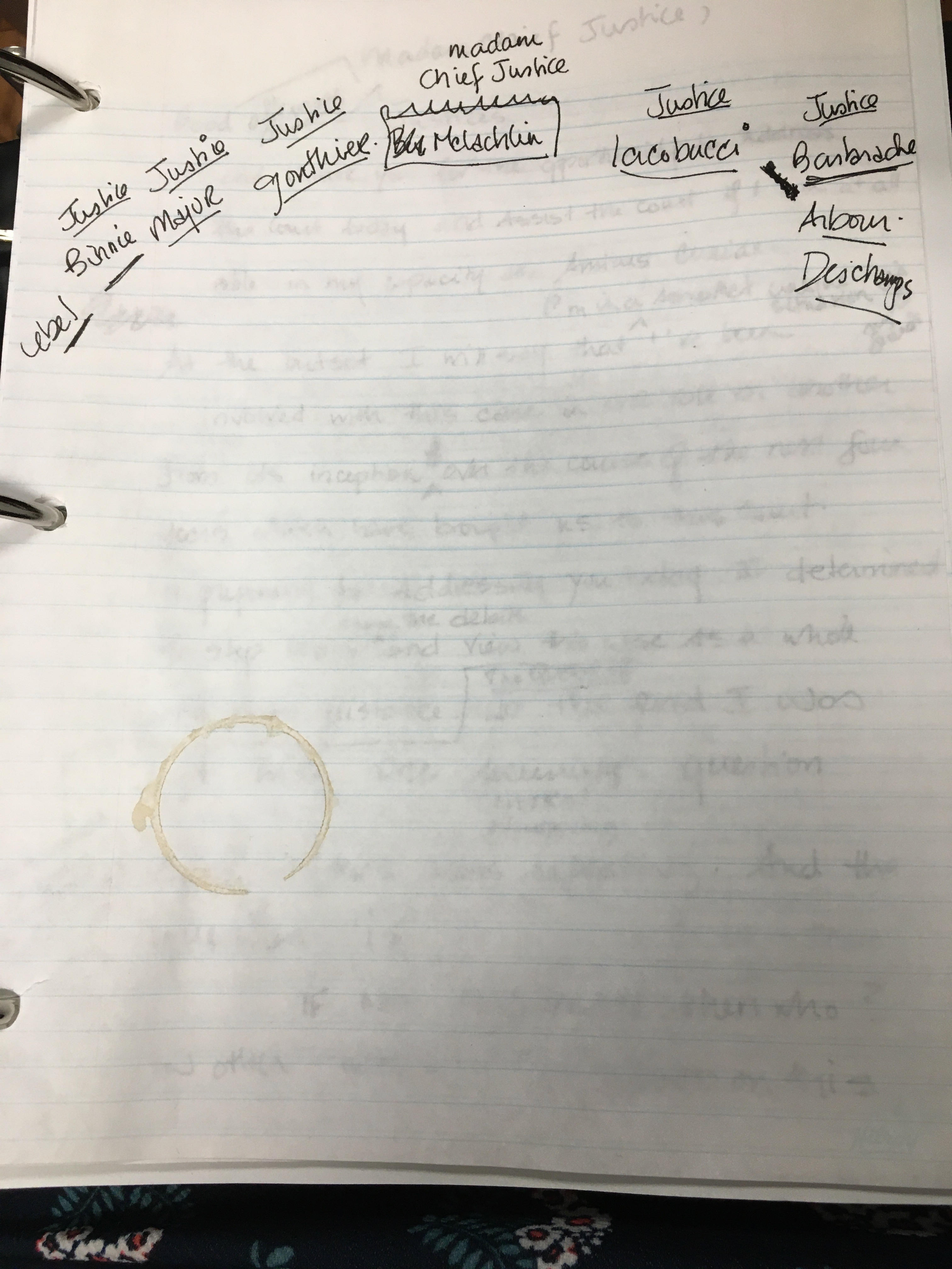 Me Mapping out the SCC Justices while starting to draft oral argument in the middle of the night up with new baby at the Ottawa Albert Suites – imprint of baby bottle of pumped breast milk – up at 4 am to feed baby and prep argument