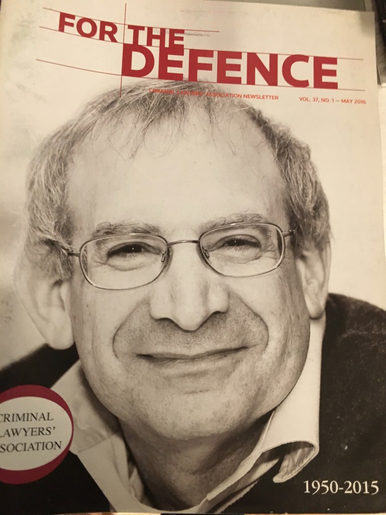 The death of Justice Marc Rosenberg in 2015 was a massive blow to the legal profession. To all of us who knew him personally. I treasure the moments I got to work with His Honour from 2000 to 2014. The amicus curiae program for Review Board appeals was Justice Rosenberg’s idea. I was fortunate that he included me as the defence facilitator for the program at its inception. I resigned from the role when my father died in 2011 but stayed on as a member of the program, assisting as friend of the Court. The program was disbanded ultimately in the wake of CLA v AG out of the SCC. But its legacy survives.