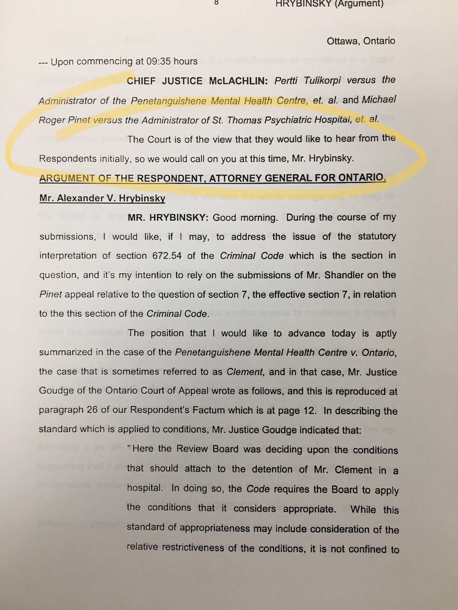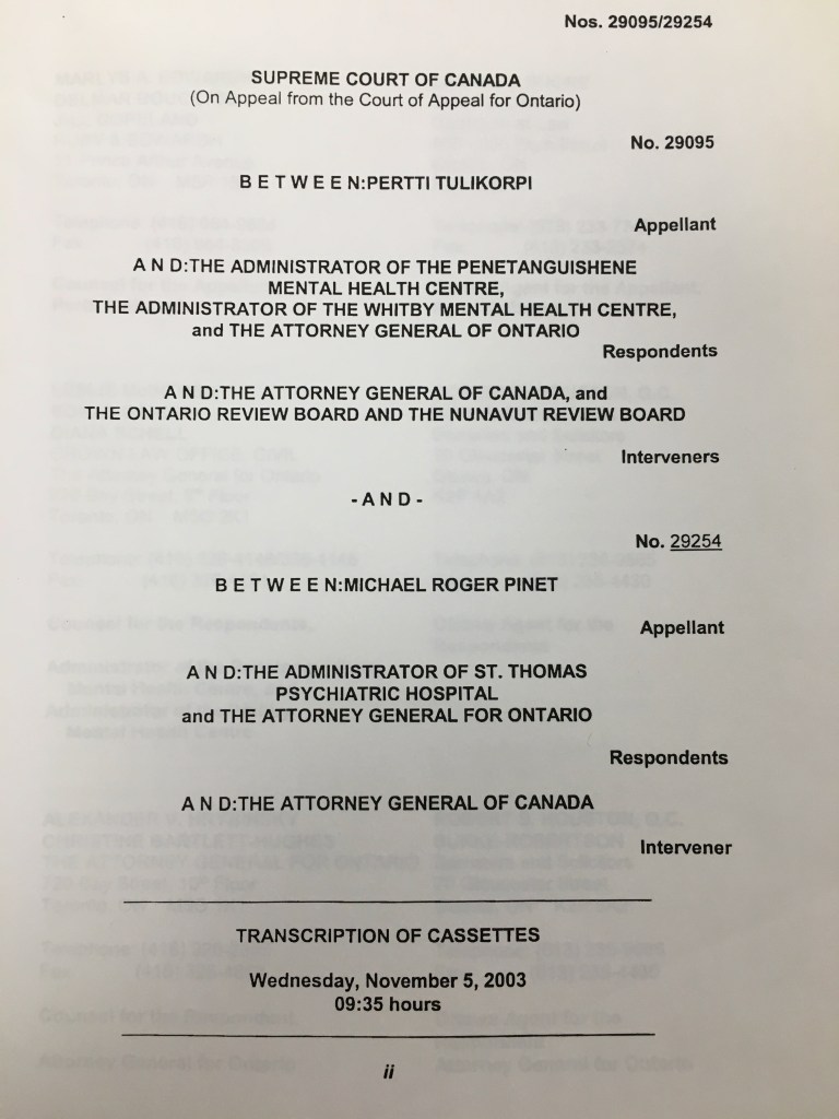 “Tulikorpi” and “Pinet” in the Supreme Court of Canada, November 3, 2003 – I was there with another lawyer as co-counsel to the Mental Health Legal Advocacy Coalition – an advocacy organization for persons with mental health issues- as Intervener