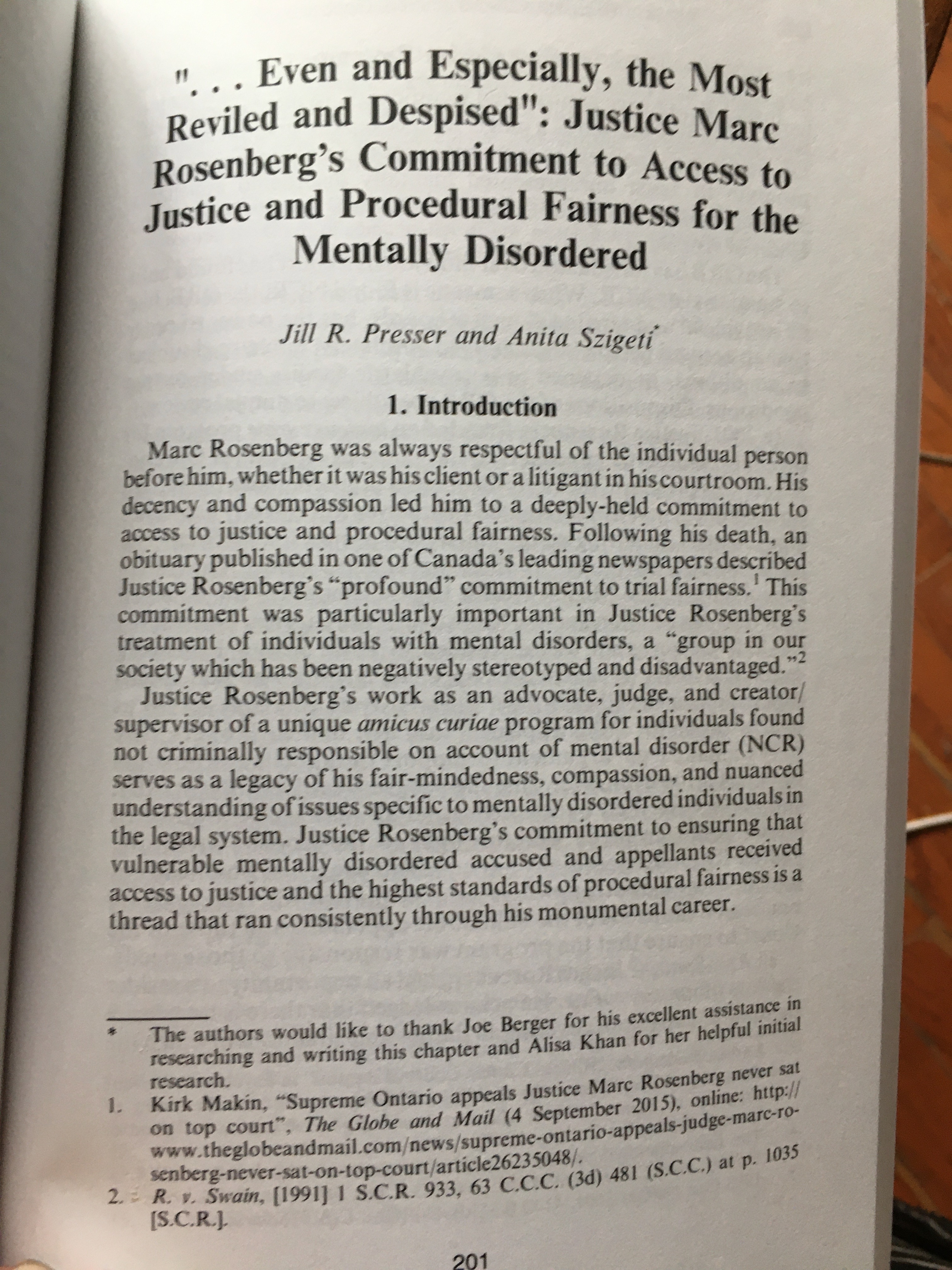 Now Justice Jill Presser and I co-authored this article in this 2017 volume honouring the memory of the late great Justice Marc Rosenberg documenting the work and successes of the Amicus Curiae Program for Mentally Disordered accused in the Court of Appeal for Ontario (2000-20114)