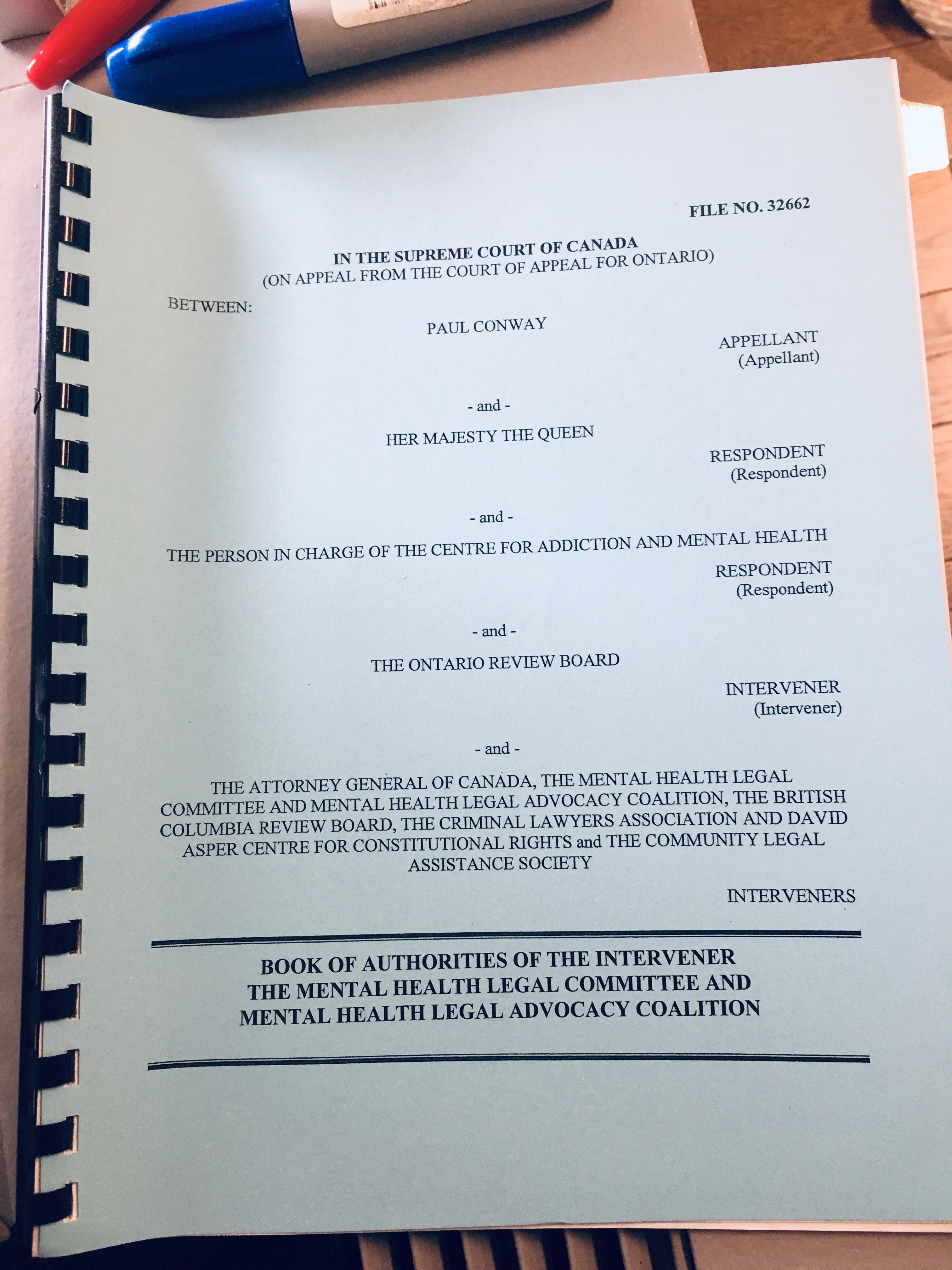 Next was Conway. I had a behind the scenes role in this one at the Court of Appeal level and many very fond memories of the work and the process. There were many great legal minds on this case. I was proud to be there for this client with co-counsel (now Justice) Paul Burstein. This case went on to have much broader impact than anyone imagined, in administrative law generally, even if its legacy for Criminal Code Review Boards is quite limited in practice.
