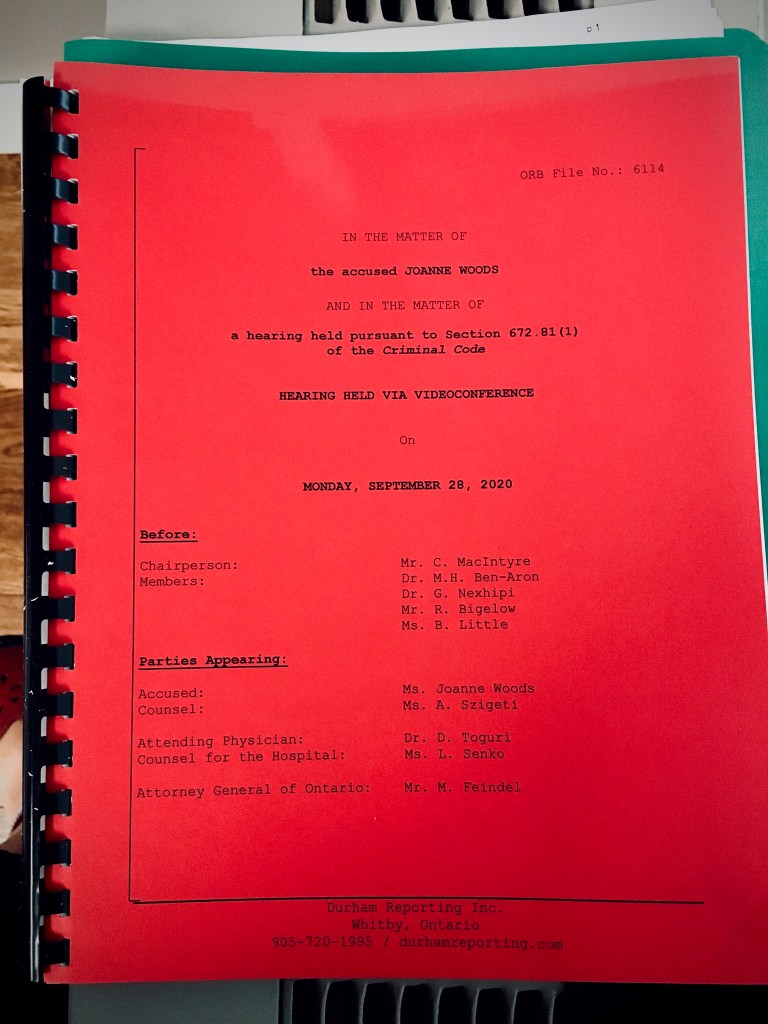 The case of Joanne Woods relates to the right to an in-person hearing before Criminal Code Review Boards. This transcript reflects one of the toughest days of my litigation career. The ONCA ultimately held the Ontario Review Board was wrong to proceed with this hearing over the objection of the NCR accused, without her consent to video-proceedings.