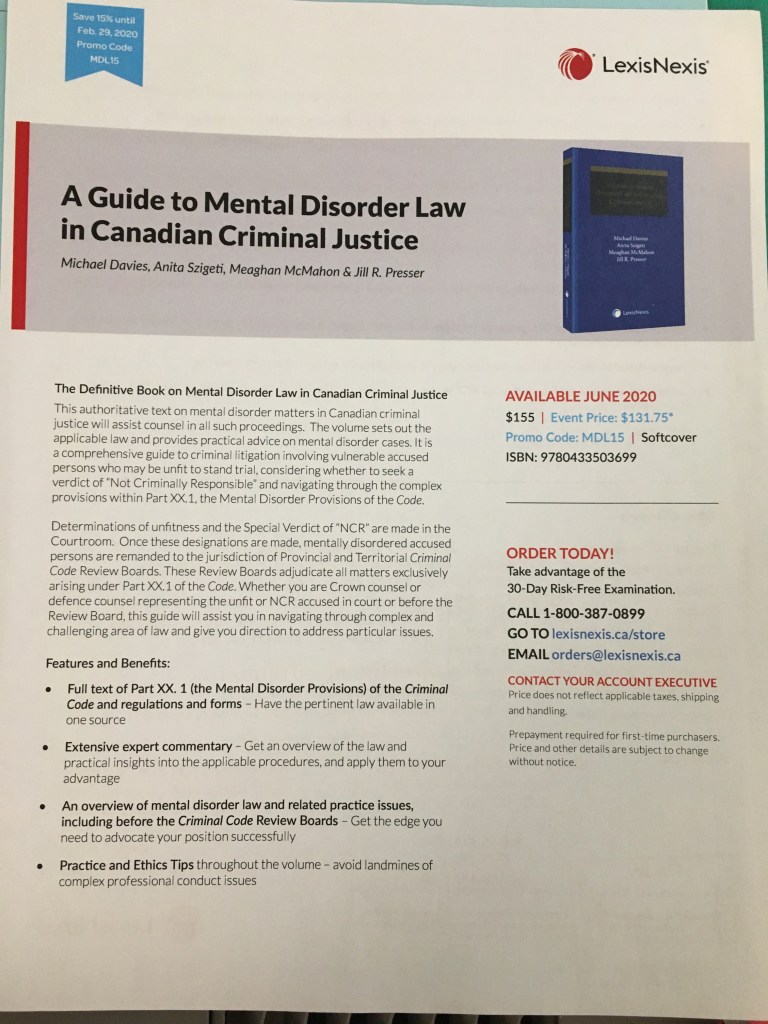 There are now 500+ Review Board appellate considerations of Ontario Review Board cases out of the ONCA – they had their genesis in the Amicus Program spear-headed by Justice Rosenberg. One of the great highlights of my career was being part of that program. Pretty well all the defence colleagues we selected together to participate on our roster to assist NCR accused are now Judges themselves. Justice Paul Burstein, Justice Joseph Di Luca, Justice Jill Presser and Justice Suzan Fraser were among the total of 7 defence lawyers who had ever served as Amicus as part of that program. One is still too young to be appointed but will no doubt get there and the other two (including me) are co-authors on what is now the seminal text in this area of law – the Guide to Mental Disorder Law in Canadian Criminal Justice (MDL Guide – LN).