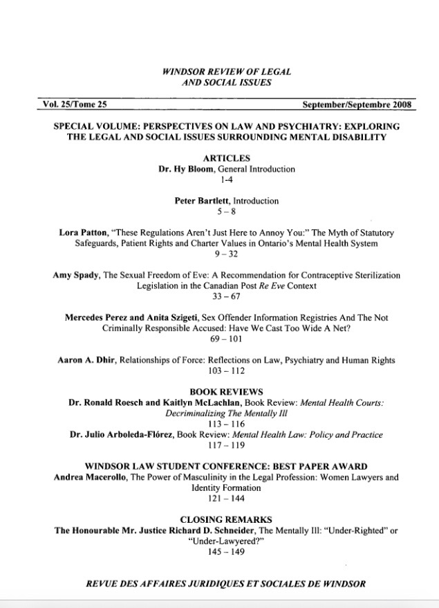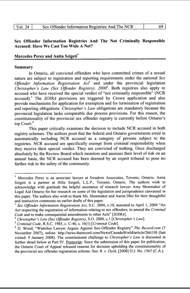 Mercedes Perez and I wrote an article on the Sex Offender Registries and NCR accused and published it in 2008, some 12 years before the case would reach the Supreme Court of Canada. We litigated the issues together early on and because we lacked resources to mount the Charter challenge we knew had to be brought, we wrote this very comprehensive paper instead early on, so that when the fight ultimately materialized there’d be a record of the cases we did and the arguments to be made when they were fresh in our minds and our research was current. This was one piece I’m always glad we wrote.