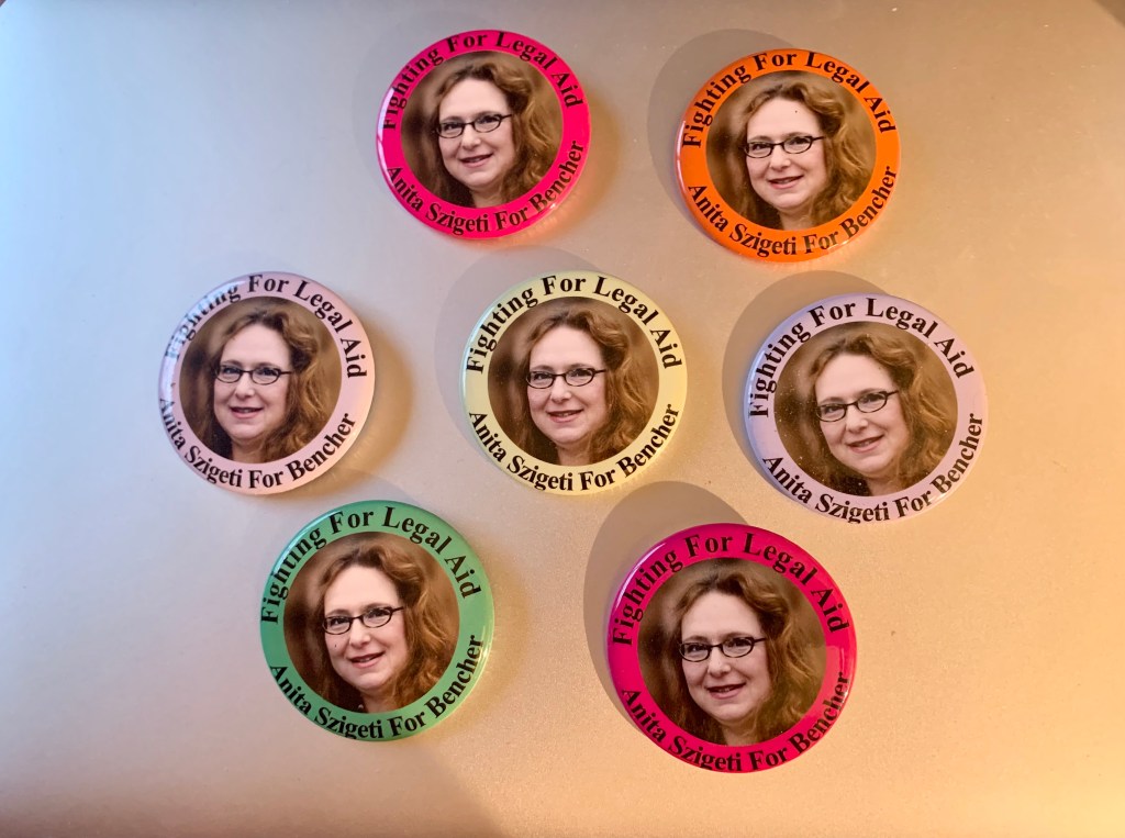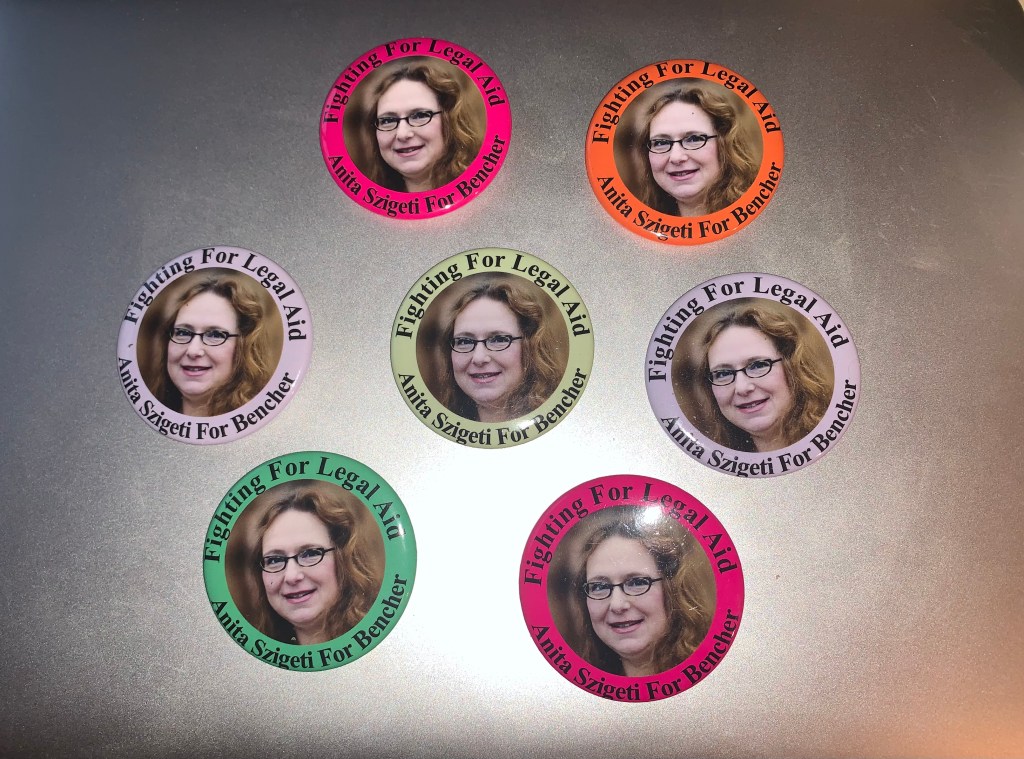 This made me smile so much – finally found a whole bag of the hand-made buttons my cherished friend and now co-author and editor Dr Ruby Dhand and I used to promote me trying to get $$ for Legal Aid Ontario by running for Bencher. I have no idea what I was thinking. Pretty tho!!