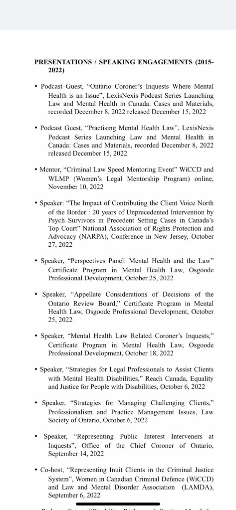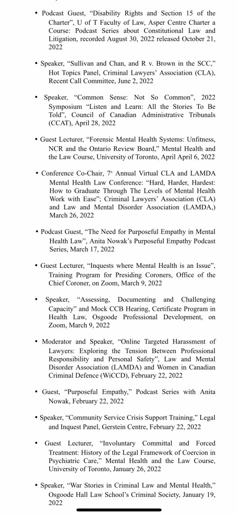2022 was the busiest and most exciting year to date for panel presentations and podcasts, webinars, all manner of sharing experiences with many new lawyers, students and colleagues. Beyond the usual fare of events such as co-chairing the annual LAMDA/CLA Mental Health Law Conference, as always, I received an unprecedented number of new request and invitations for speaking engagements. Too many to set out here, but I did decide to post my CV to my blog to faciliate some responses to these invitations, which you can view here: