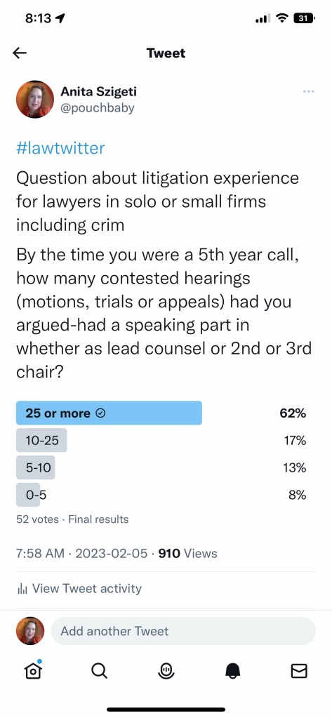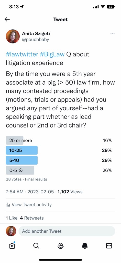 I’ve been wondering whether the level of actual litigation experience young lawyers are exposed to in Big Firms vs small or solo practices is readily ascertained via a small questionnaire.