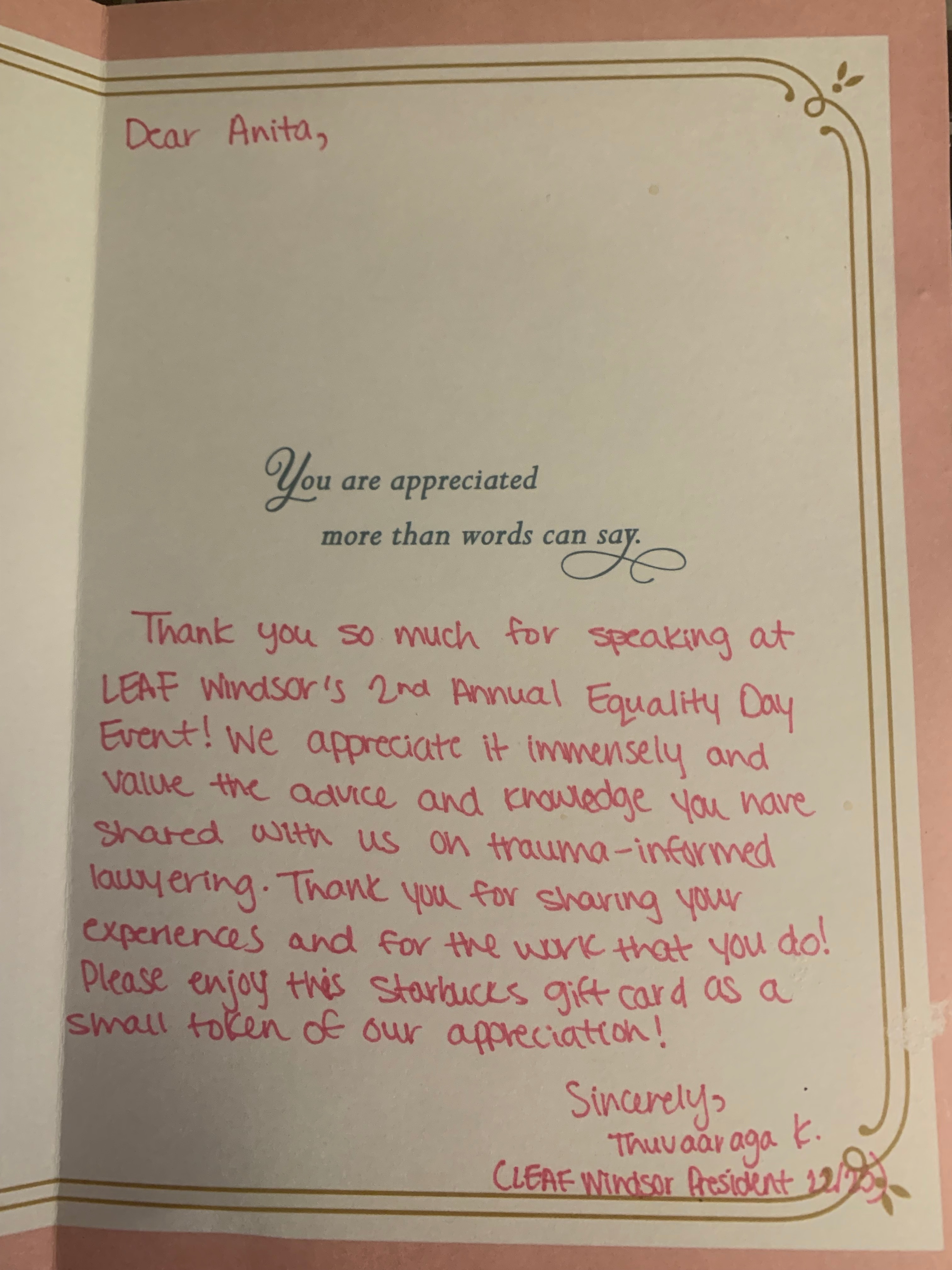 I got a lovely Starbucks gift card in the mail and a beautiful note I will cherish.