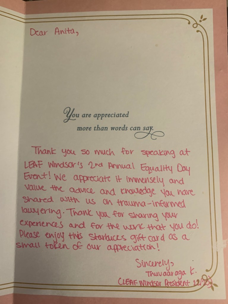 It was really invigorating to speak with Windsor Law students and members of the Windsor Chapter of Women’s Legal Education and Action Fund, on a panel with two other fabulous women lawyers about the importance of trauma-informed lawyering.