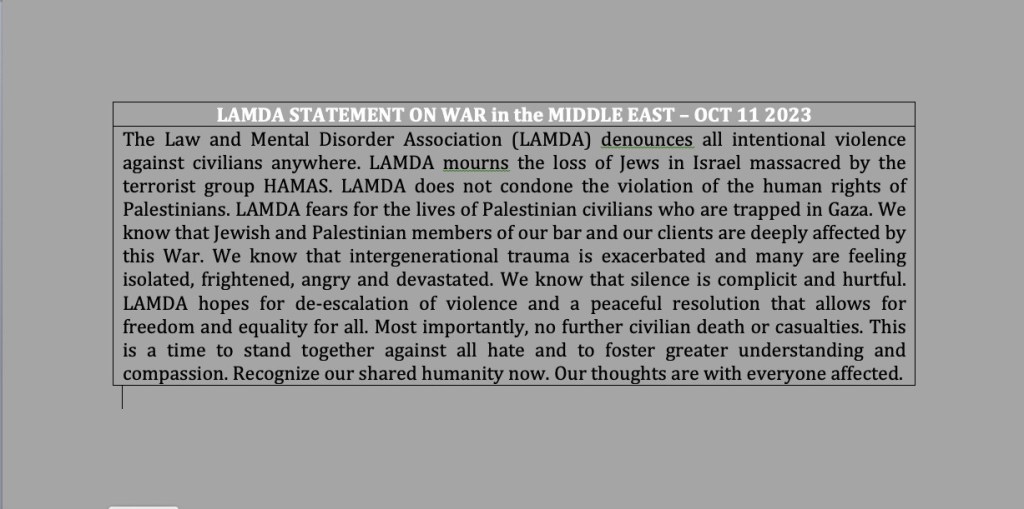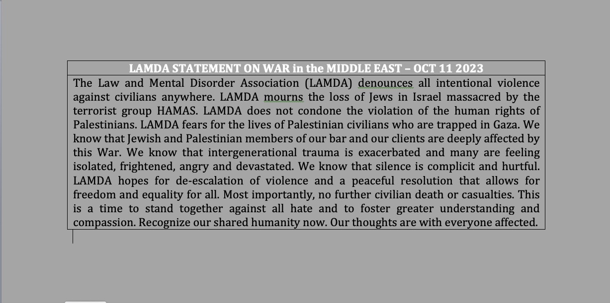 On Oct 11 2023, the Law and Mental Disorder released this Statement on the War in the Middle East