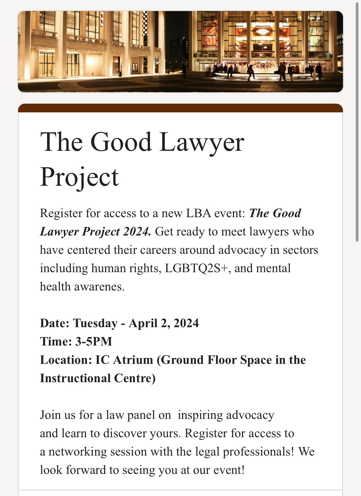 Register for access to a new LBA event: The Good Lawyer Project 2024. Get ready to meet lawyers who have centered their careers around advocacy in sectors including human rights, LGBTQ2S+, and mental health awarenes.