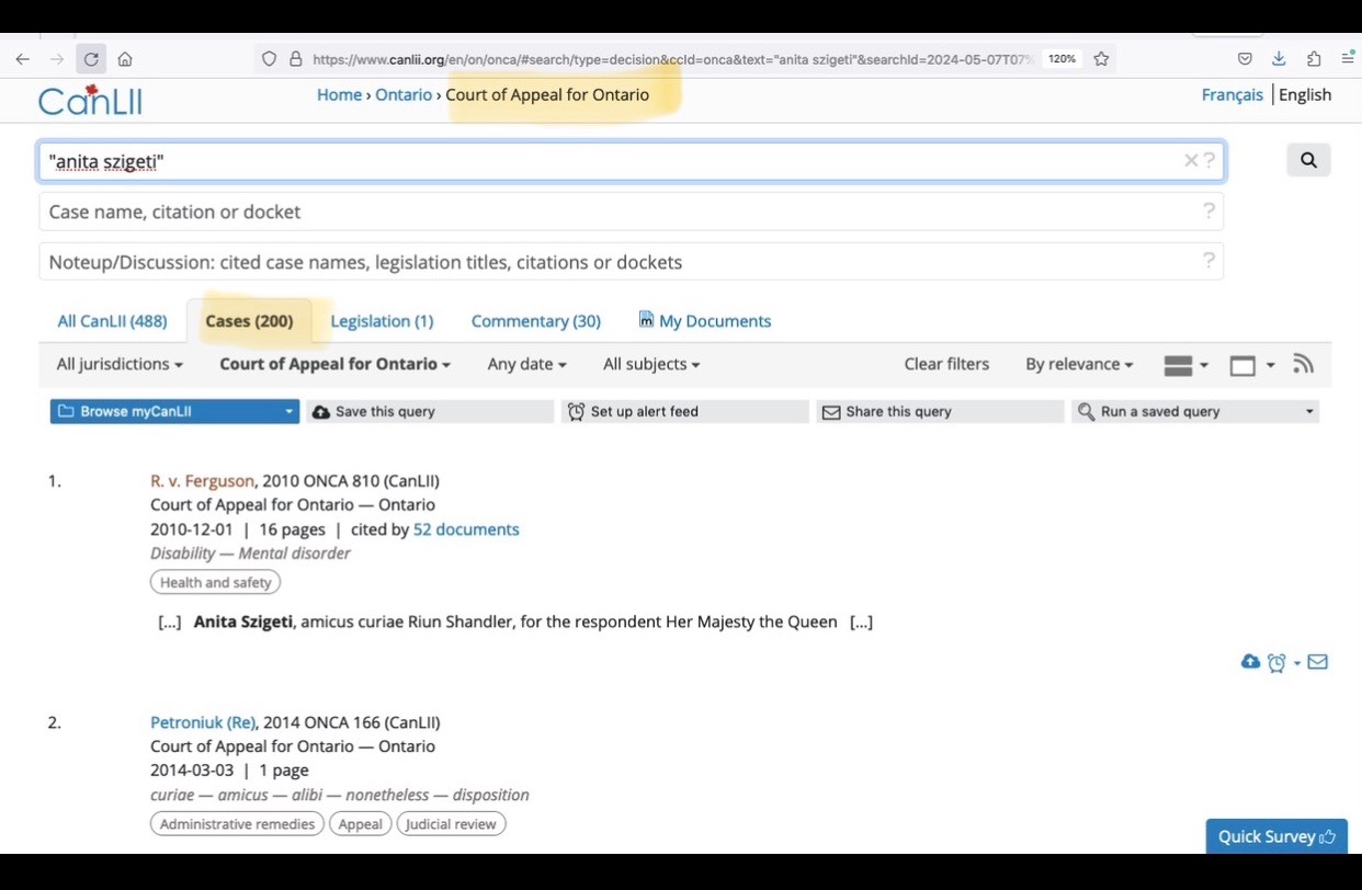 Even searching for my full name exactly as it would appear, which minimizes hits, and even without reporting my early dozens of Appeal Book Endorsements that are not included in such searches today I realized CanLII is showing exactly 200 … Continue reading 200 Reported Ontario Court of Appeal Cases Milestone Reached on CanLII May 6 2024 for “Anita Szigeti”