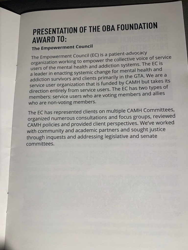 With all that said, however, of course the highlight of the evening for me had to be watching Jennifer Chambers accept the Empowerment Council’s OBA Foundation Award. I am brimming with pride! Much gratitude to Ed Upenieks who suggested we nominate the EC for this special honour. It was also great to see Ed!
