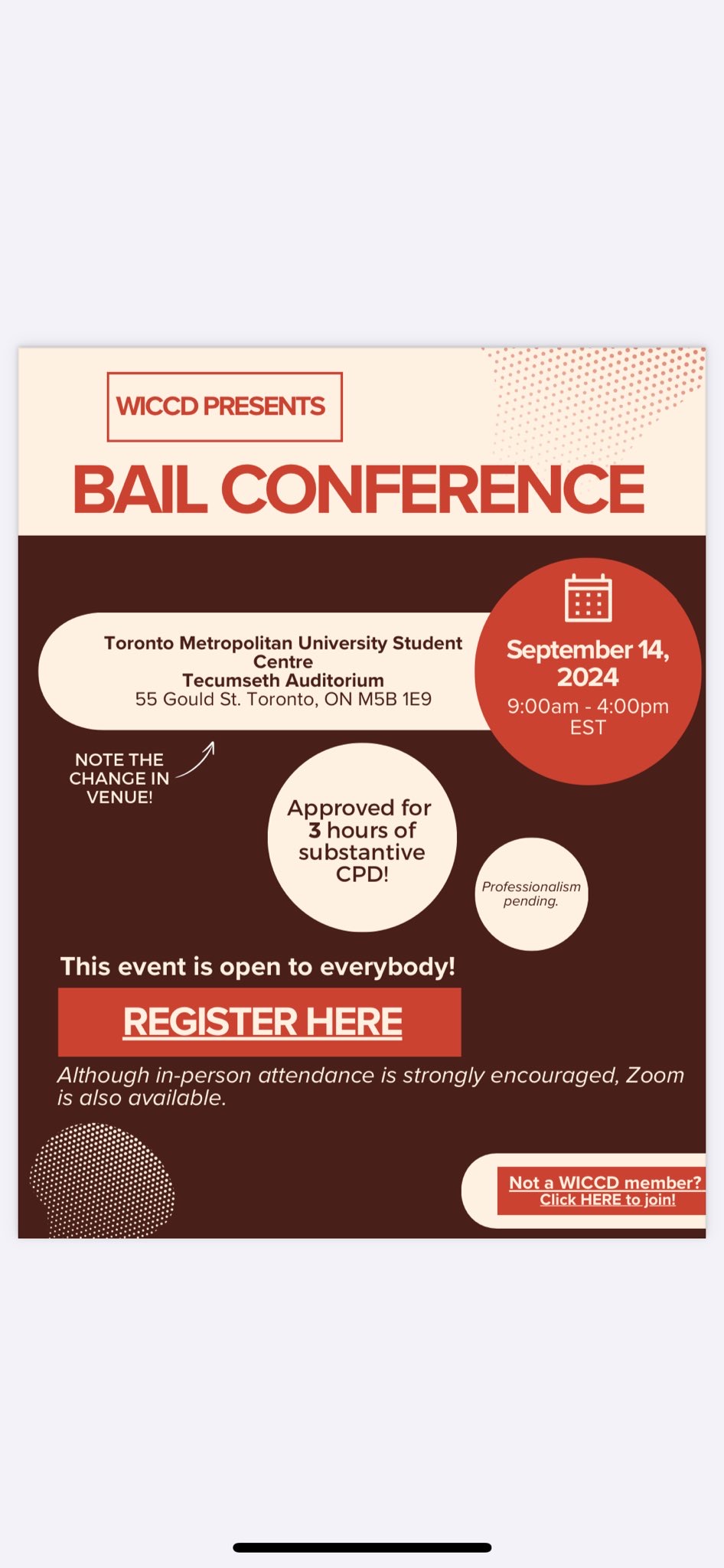 Thanks to the incredible efforts of WiCCD’s Education Director and Associate Secretary Maya Shukairy and His Honour Justice Brock Jones of Toronto’s OCJ, WiCCD hosted our first large scale hybrid conference on Bail at the TMU Student Centre’s Tecumseth Auditorium on Saturday, September 14, 2024.