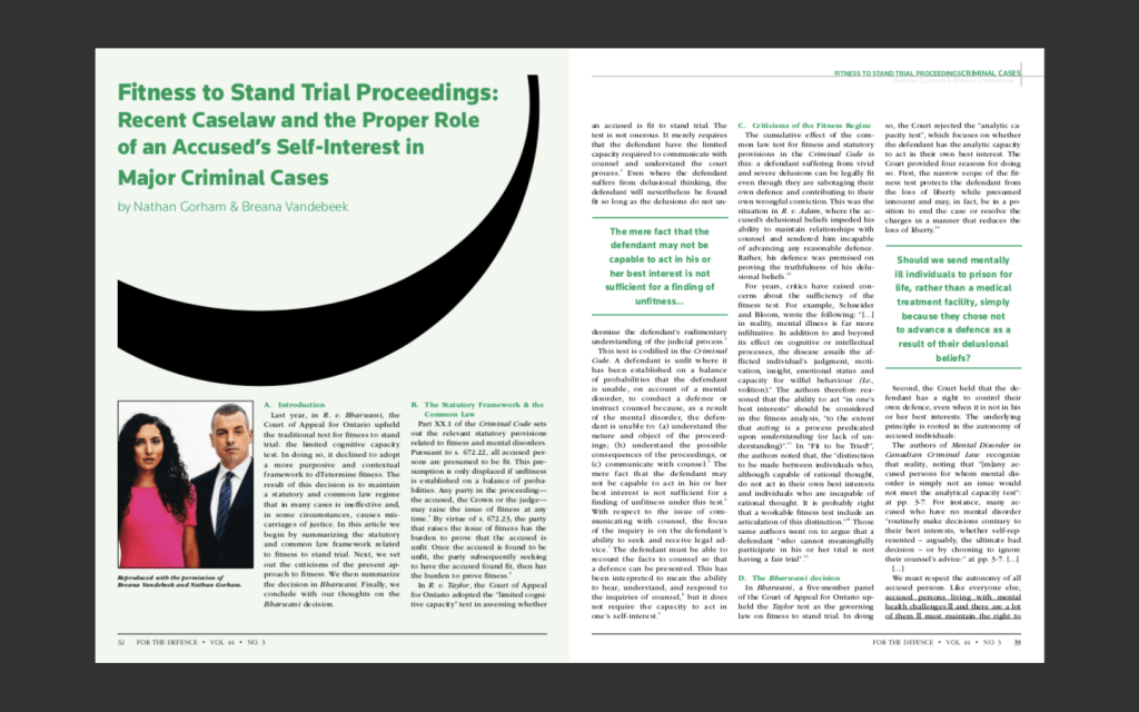 Volume 44 No 3 of the Criminal Lawyers’ Association’s For the Defence Magazine (August 2024) edited by Neha Chugh includes an article by Breana Vandebeek and Nathan Gorham that critiques the low threshold for fitness the Court of Appeal for Ontario maintained in Bharwani. It’s as good an articulation of that argument as you’ll find. It captures the frustration of a not insignificant percentage of defence lawyers who struggle to work with clients when they’re unwell.