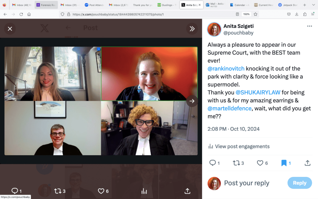 For Bharwani, EC and I have brought the band together again, with most of the co-counsel team that represented this client with me on R. v. Kahsai except this time Sarah Rankin who was counsel to another intervener on Kahsai joins our team on Bharwani – Hooray!