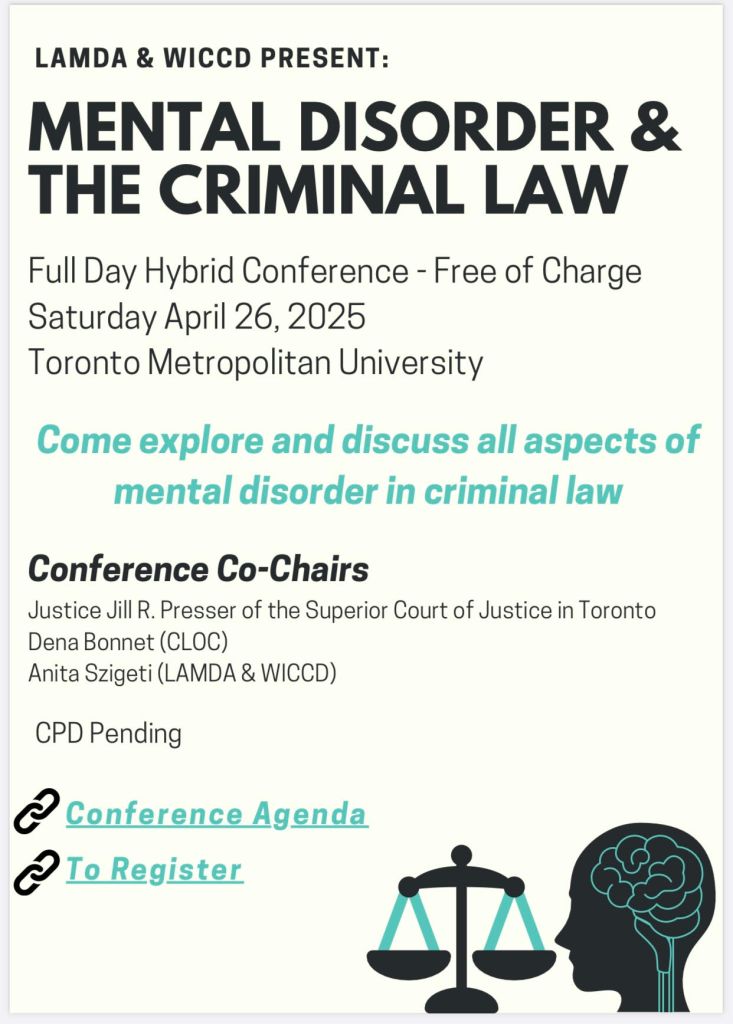 Pingback: LAMDA and WiCCD’s First Mental Disorder and the Criminal Law Conference April 26 2025 a HUGE SUCCESS!! | anitaszigeti