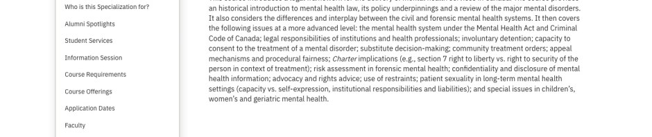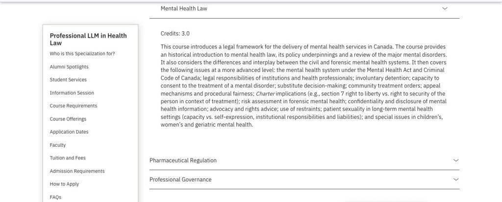 The course description in brief is found here: https://osgoodepd.ca/academic-programs/professional-llms/health-law/ by choosing the Mental Health Law tab in the Elective Courses Menu
