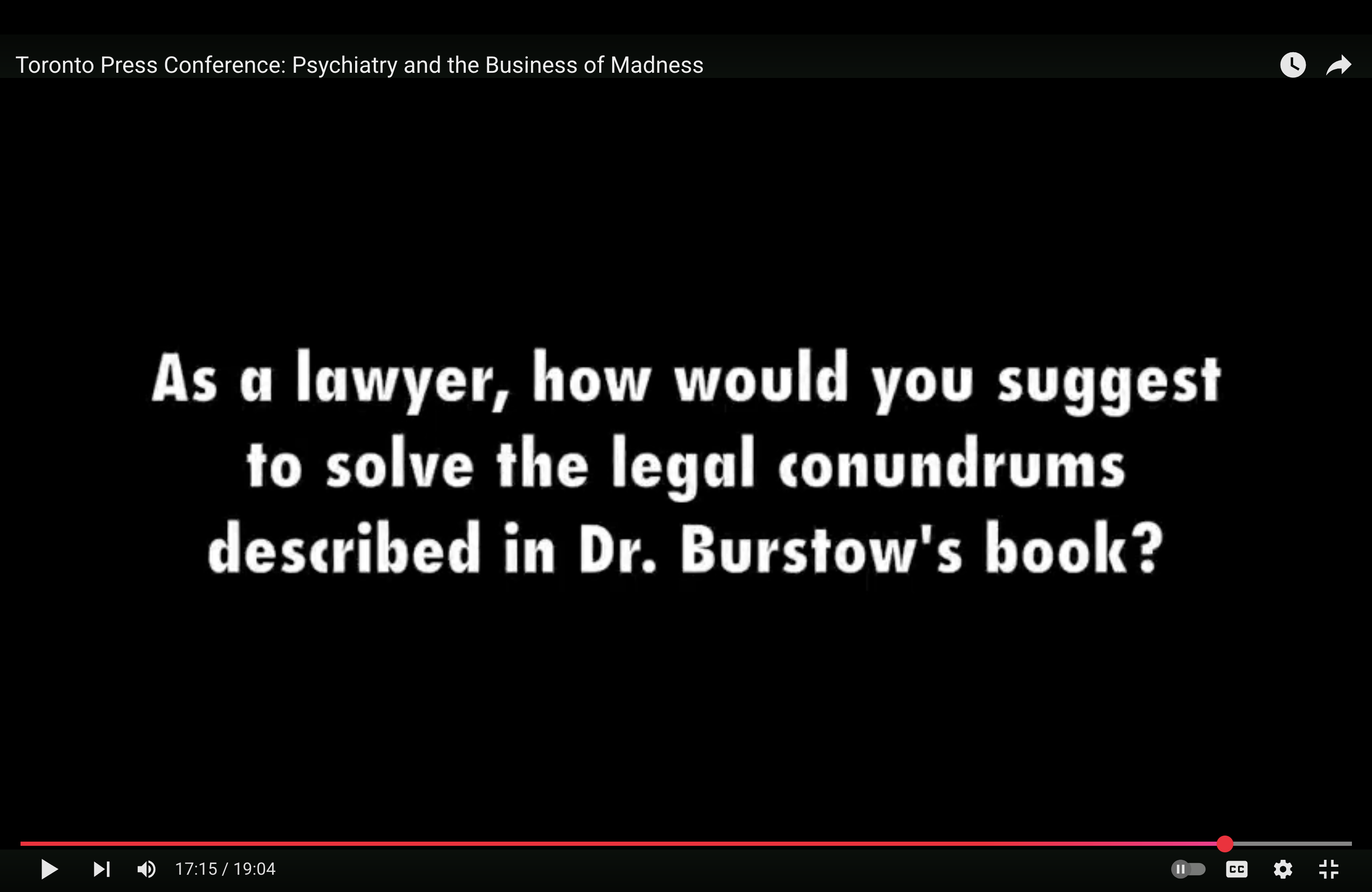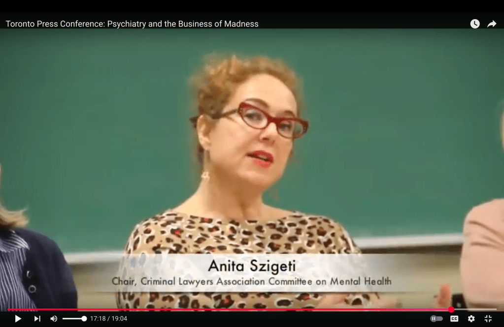 At this book launch at about the 10 minute mark, I talk about why the book is so significant from a legal perspective. Bonnie had observed many hearings of Ontario’s mental health tribunals herself and critiques their proceedings from her informed and academic perspective as well as the critical view of someone who identified as a survivor.