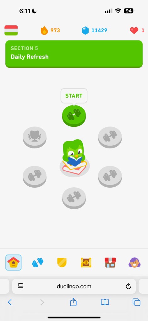 So I get up super early every day, do my little Wordle and then scroll through Duolingo lessons in 4 languages. I’ve been at Spanish for almost three years, just started Italian and keep my Hungarian fresh.