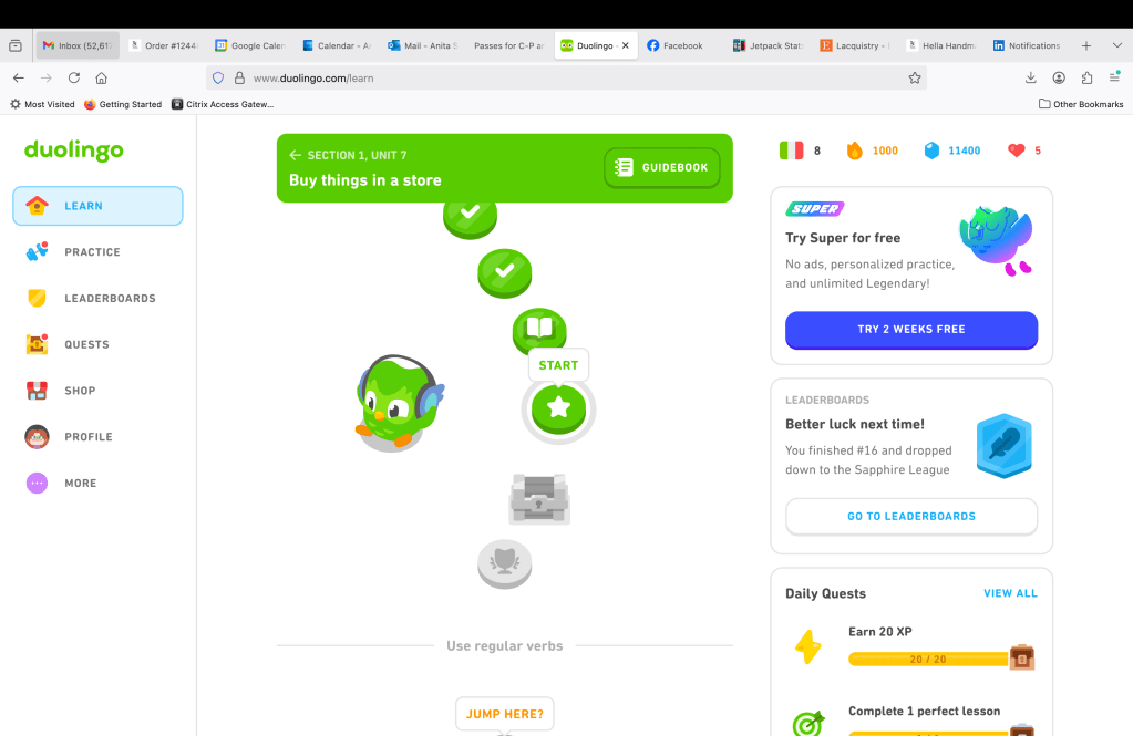 Spanish is 3 years in with a strong beginner level unlocked… yikes!