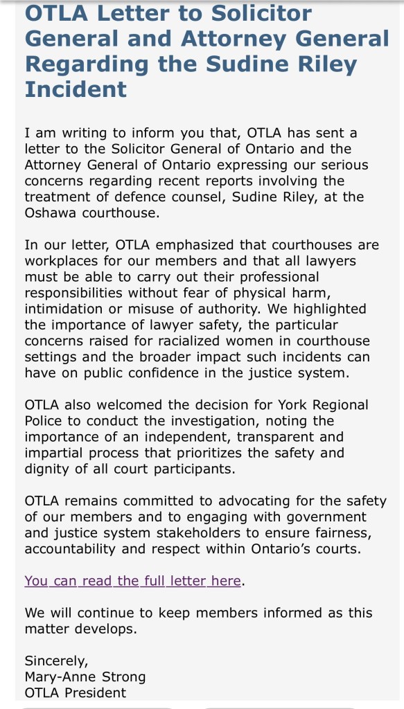 - What I’ve compiled here are statements in support of Sudine Riley or expressing alarm and seeking an independent investigation into the incident as reported – I’ve not included the Statement released by the Durham Regional Police Association (DRPA) which disputes the allegations and expresses distaste for criminal defence lawyers