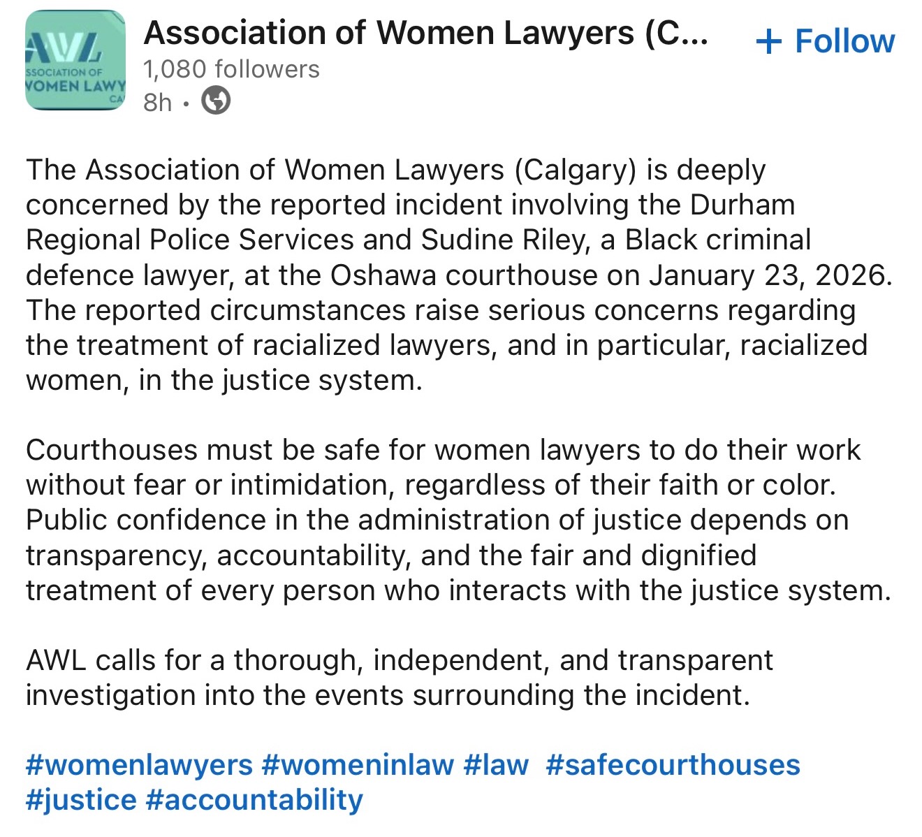 By January 28 2026 the number of Statements in Support of Ms. Riley and opposing violence against lawyers, defence counsel, women who work in the justice system, Black and racialized legal professionals, had grown such that cataloguing photos of the Statements was becoming cumbersome.