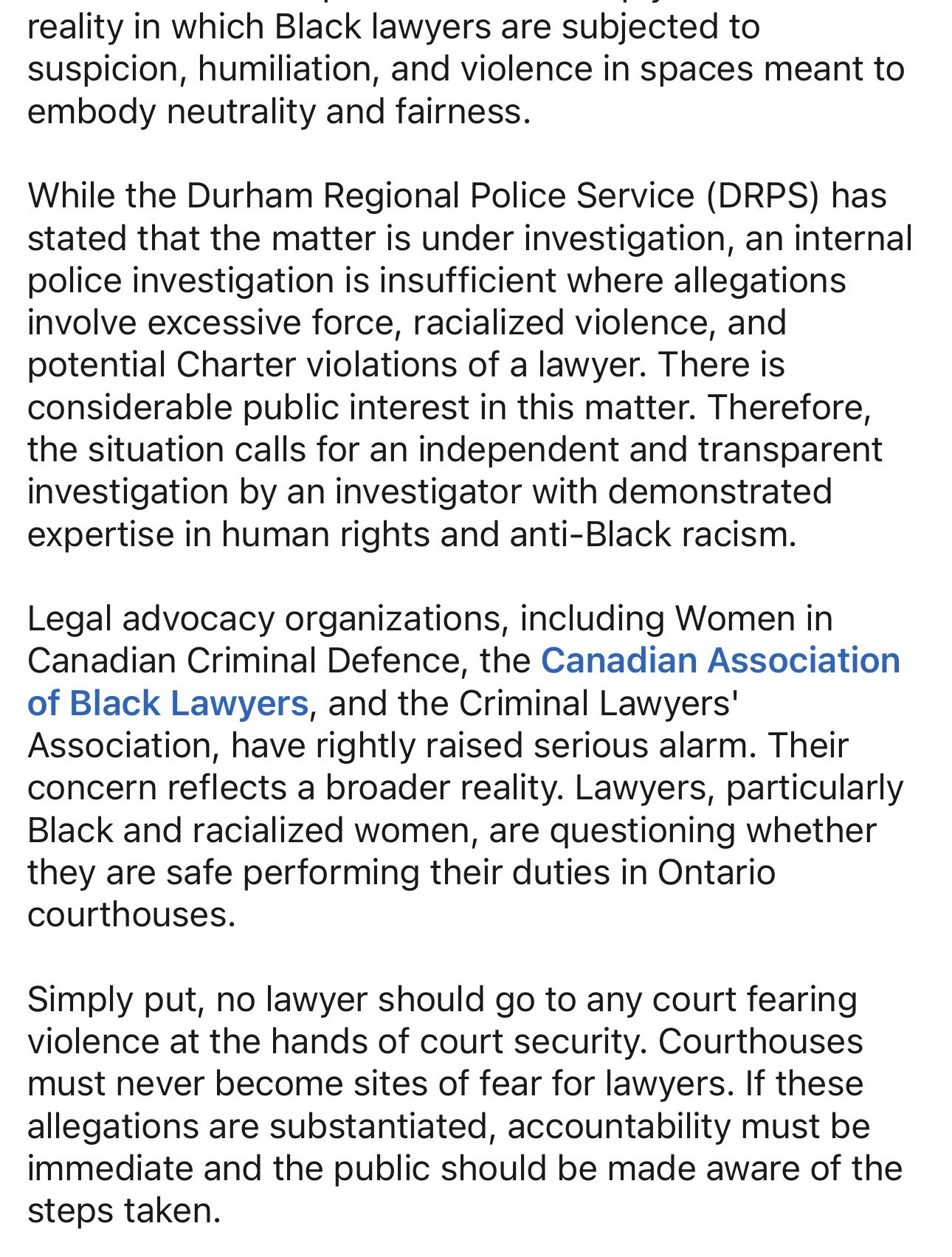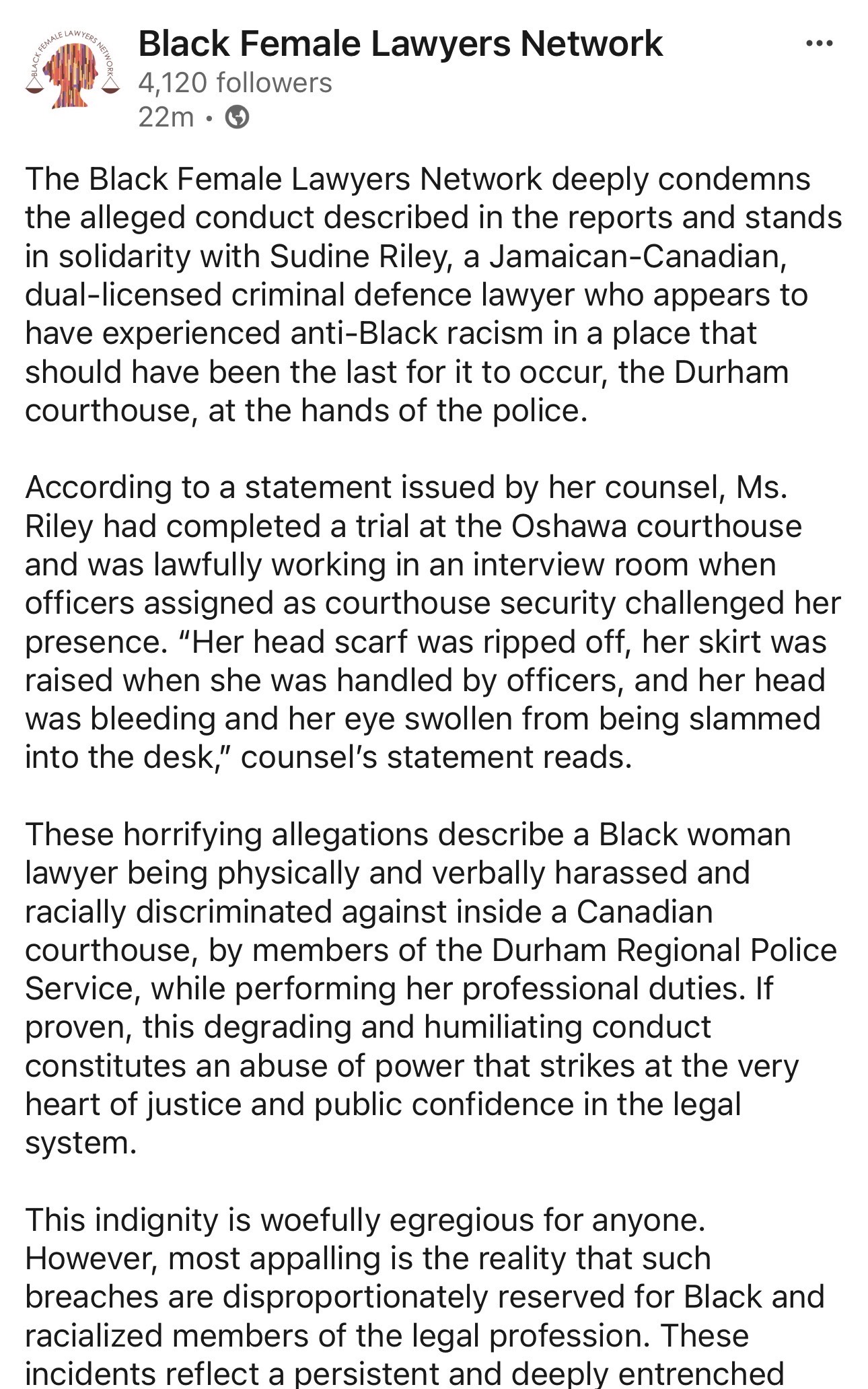 - What I’ve compiled here are statements in support of Sudine Riley or expressing alarm and seeking an independent investigation into the incident as reported – I’ve not included the Statement released by the Durham Regional Police Association (DRPA) which disputes the allegations and expresses distaste for criminal defence lawyers