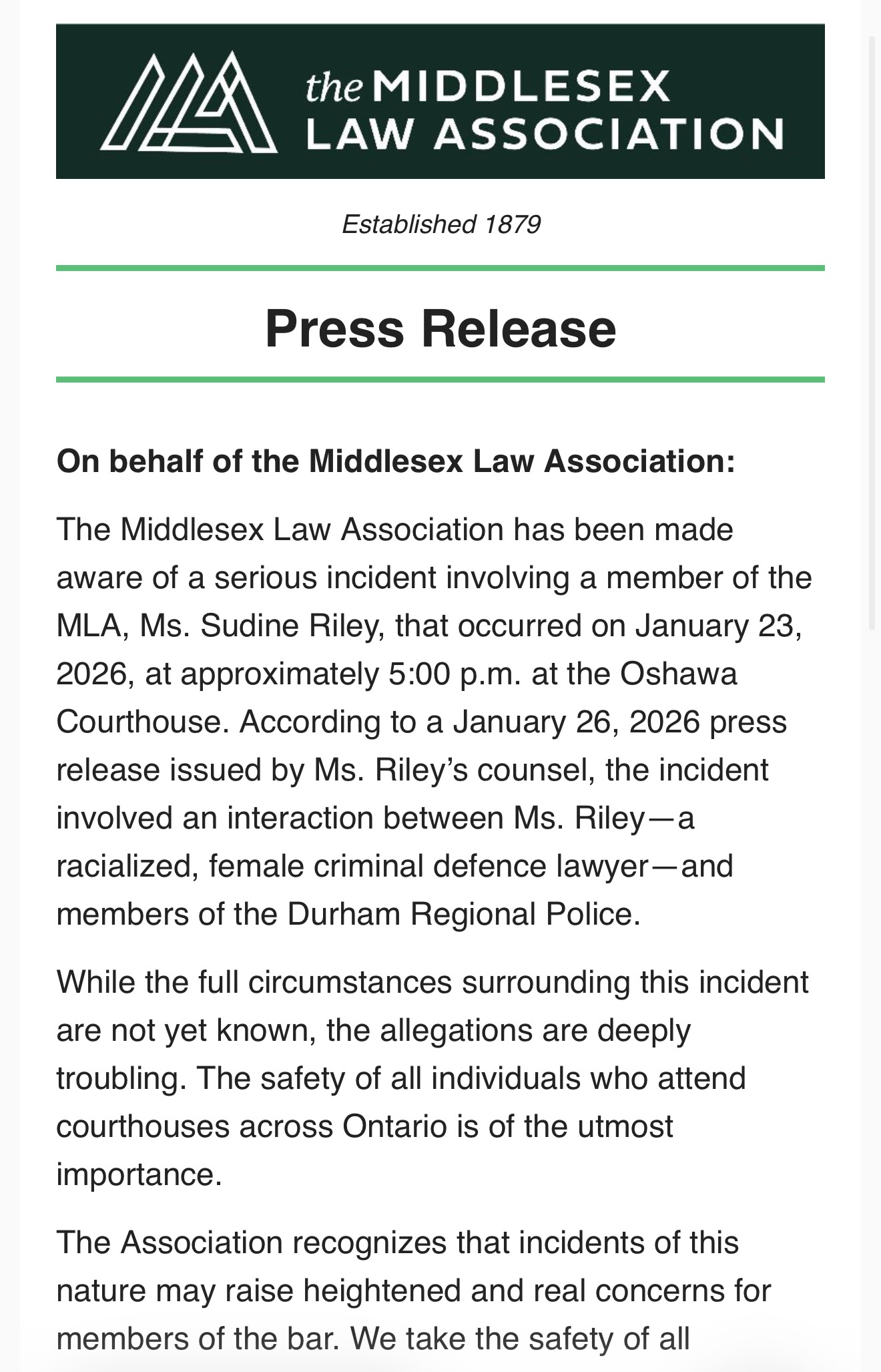 STATEMENTS REGARDING SUDINE RILEY AND THE OSHAWA COURTHOUSE JAN 2026