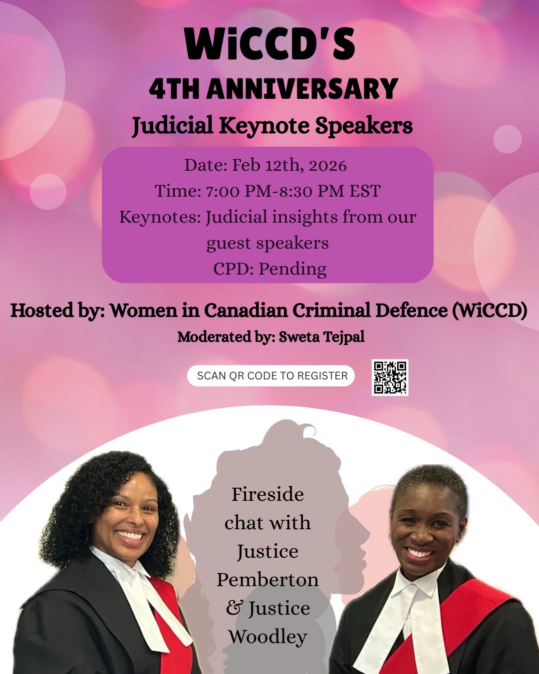 Women In Canadian Criminal Defence is celebrating our 4th birthday on Feb 12 2026 and we are honoured to host Justice Shauna Pemberton and Justice Alayna Janai Vivienne Woodley as our Keynote speakers with whom we will also have a fire-side chat. Hosted by Sweta Tejpal, a member of our Executive.