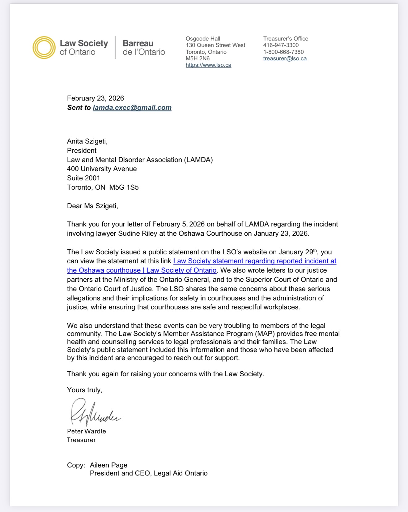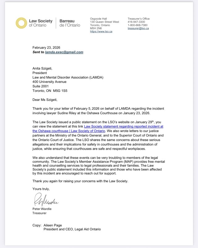 One week ago today, on Thursday, February 5, 2026, the Law and Mental Disorder Association wrote to Ontario’s Attorney General Doug Downey, Deputy Attorney General Randy Schwartz and the Treasurer of the Law Society of Ontario, Peter Wardle, asking what is being done for the defence bar in the wake of this incident.