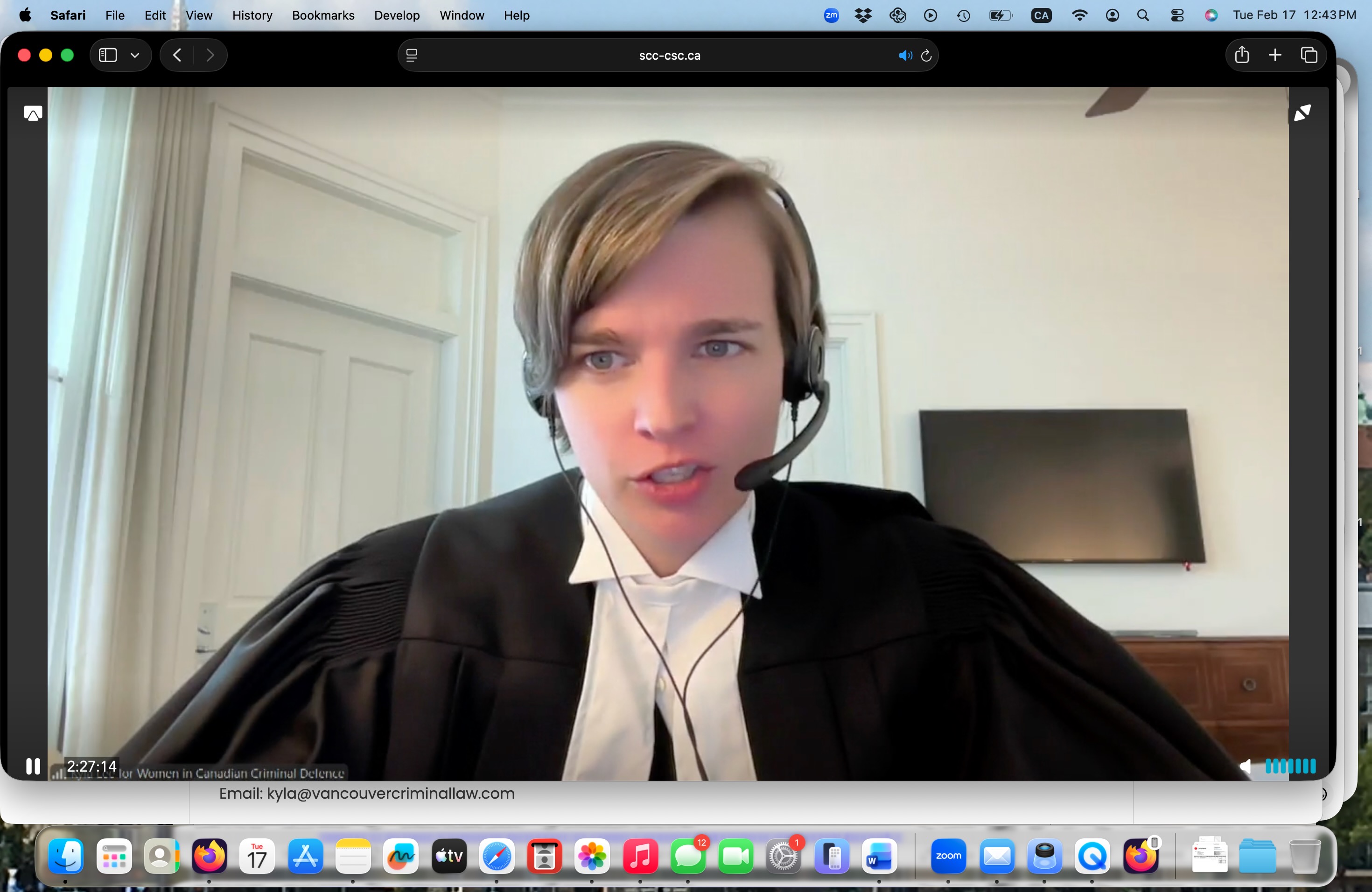 A seemingly countless parade of male lawyers before us, but with one other woman representing the Saskatchewan AG, Kyla Lee represented WiCCD last, and was the only woman presenting for the defence or the Appellant’s side at all, among all the parties’ and interveners’ counsel.
